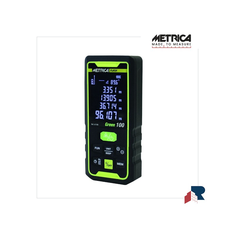 Distanziometro misuratore laser Flash Green di Metrica, portata 100 mt, laser colore VERDE.